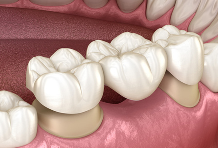 欠損歯を補うために隣接する歯を削って被せ物で橋渡しするブリッジ治療。入れ歯のように取り外しする必要はありませんが、被せ物になるため、歯を削る必要があります。