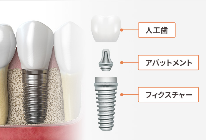 当院では、インプラント外科手術を実践しています。フィクスチャー(ネジ)、アバットメント(連結部分)、上部構造など機能性、審美性の高い歯科素材を使用します。